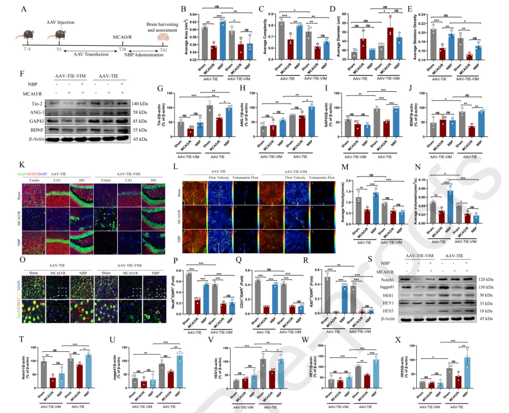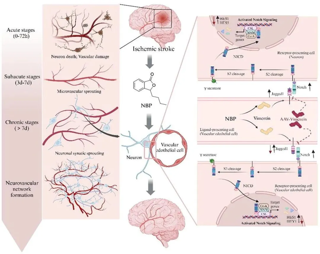 研究结果表明, NBP通过重塑微血管系统以促进神经修复,有效治疗缺血性卒中。VIM被确定为NBP 的新靶点,这为探索VIM在神经血管耦合中的作用奠定了基础。进一步机制研究显示,NBP通过靶向VIM调控Notch信号通路,进而促进缺血性卒中后的血管新生与神经修复。