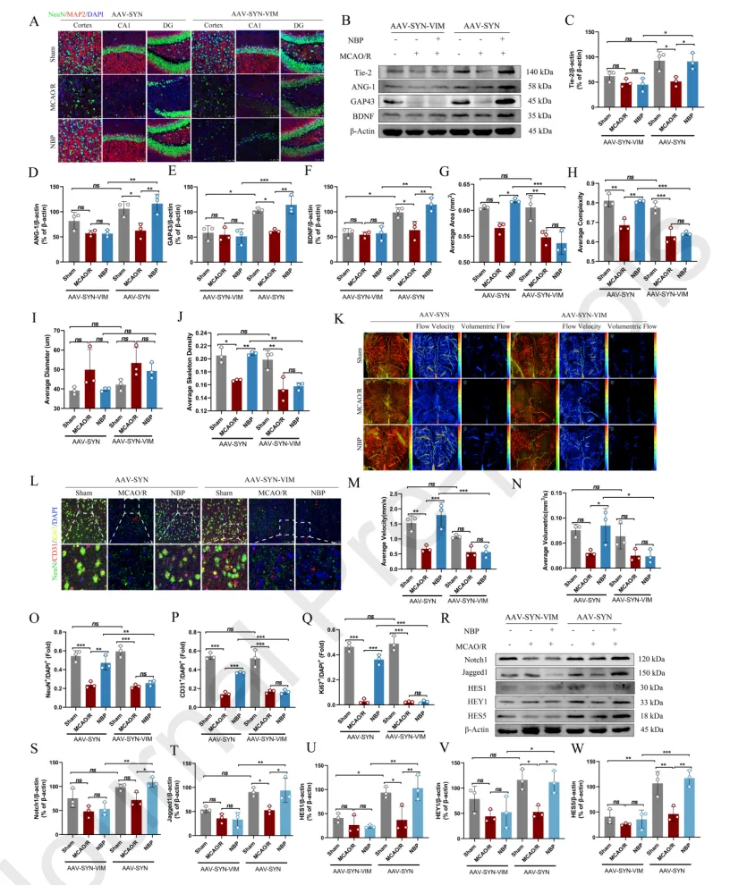 结果五:构建了特异性敲低神经元中的VIM的小鼠模型,研究发现特异性敲低神经元中的VIM未显著影响新生血管形成,但对神经修复产生影响。研究显示NBP通过靶向VIM,进而激活了在血管新生和神经发生中都起关键作用的Notch信号通路,从而协调促进卒中后的微血管重建与神经修复。