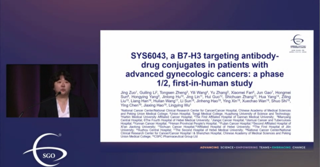 B7-H3在妇科肿瘤中广泛高表达,几乎90%的卵巢癌和子宫内膜癌,70%的宫颈癌均存在B7-H3表达,中高表达比例接近50%;不同于HER2等靶点,B7-H3在妇科肿瘤中表达异质性低。既往的研究显示,B7-H3高表达与不良预后密切相关,且在免疫抑制剂或PARP抑制剂经治后表达增高,提示其在妇科肿瘤中是极具前景的治疗靶点。SYS6043是一款新型B7-H3靶向ADC,载荷为拓扑异构酶I抑制剂,药物抗体比(DAR)约为6,采用Fcγ受体效应沉默设计和可裂解连接子,旨在增强抗肿瘤活性并降低脱靶毒性。