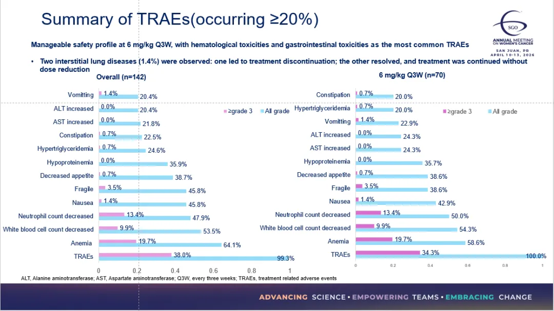 安全性结果显示,在总体142例患者中,任何级别的治疗相关不良事件(TRAEs)发生率为99.3%,≥3级TRAEs发生率为38.0%。在6 mg/kg Q3W队列(n=70)中,任何级别TRAEs发生率为100%,≥3级TRAEs发生率为34.3%。因TRAEs导致的剂量减少和治疗终止发生率较低,分别为7.0%和0%。治疗相关死亡事件发生1例(0.7%)。SYS6043整体和6 mg/kg Q3W(推荐剂量)表现出可管理的安全性,最常见的治疗相关不良事件为血液学毒性和胃肠道毒性,经治后易恢复。其中,血液学毒性以贫血、白细胞下降和粒细胞下降为主,胃肠道毒性以疲乏、恶心、食欲下降为主,与同类药物相比,血液学毒性和胃肠道毒性发生率低。142例患者中观察到2例间质性肺病发生,其中1例导致停药,另1例恢复后继续治疗。